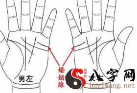 在左手无名指和小拇指指缝间下斜斜的两花纹,表明这人会有言究写作的才可以。能够从业研究或创作美术绘画,一定有造就。