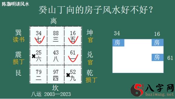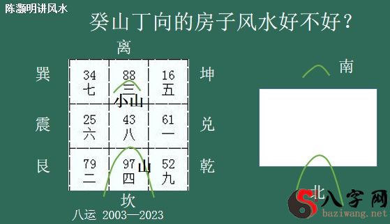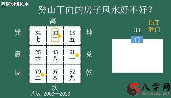 那麼最旺的是啥?是向方新星。 向方这颗星是最旺的,并且是双八到向,它是十分聚财的,所以说假如大门口在这个部位,癸山丁向的房屋大门口在这儿,它就合乎双八到向,那麼这一门它就可以纳财气。离宫为南方,假如门在南方,大家就可以判断这一住宅它是十分聚财的,住进来之后财气很好,所以说这一门叫财门,大家开过一个财门。可是它也有一个缺陷,缺陷便是山星八白也来到这一部位,那麼山星八白假如飞到这一部位,它会有一个龙神下水。因此 这一门尽管是财门,可是它另外也是一个损丁的门。它会造成 一个什么结果呢?便是聚财不旺丁,而且财越旺,丁越损。丁意味着的是健康,意味着人体。