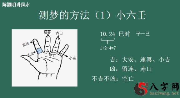 例如我们一醒,见到的是5点,我们可以立即从5来数。12345,小吉。举个例子,例如睡醒之后,随后你看到某一人讲过一个数据,讲过一个8,大家就用八来数,12345678,留连,这一是否可以使搞清楚?这个是很灵便的。你也能够醒来后翻开书翻一页,看一下多少钱页,例如140页,大家就1 4=5,12345,就出来。这一叫便捷法决,大伙儿能够大约的了解是吉是凶。如果是吉,能够无需去管它,如果是凶得话,留意一下就好了。